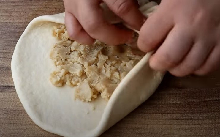 Supilkite į pyragą iki 5 mm storio, viduryje įdedame įdarą ir suspaudžiame apskritimą, kad jis pasirodytų apvalus.
