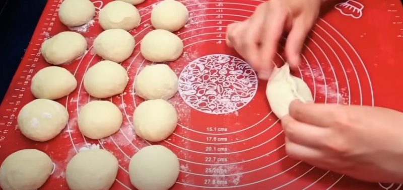 Pabarstykite stalą miltais, išdėliokite tešlą ir padalinkite ją į porcijinius rutuliukus, kaip pyragams.