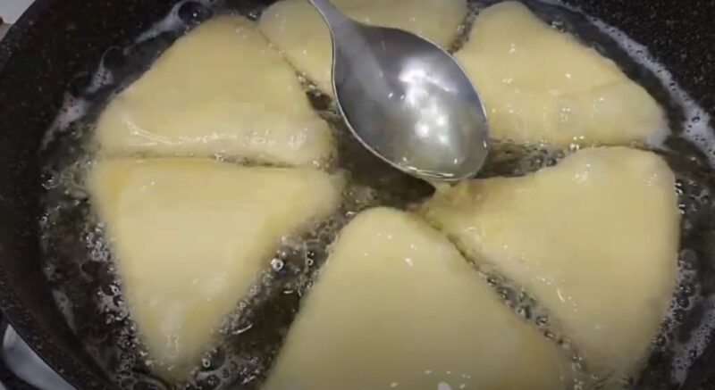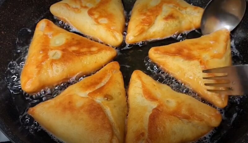 Mes sugriebiame tešlos kraštus trikampio pavidalu, pasukite pyragus žemyn. Keptuvėje sušildome 100 ml augalinio aliejaus, į jį įdėkite pyragus.