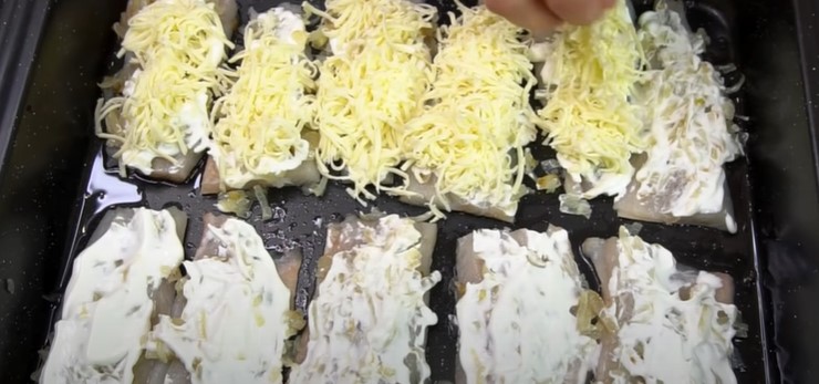 Pasūdome, papipiriname, pabarstome prieskoniais ir aromatinėmis žolelėmis, apibarstome kepintais svogūnais ir padarome majonezo tinklelį.