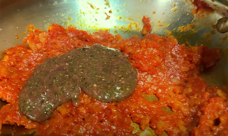 Į svogūnus sudėkite sutrintas slyvas ir prieskonius ir troškinkite dar porą minučių. Galiausiai sudėkite konservuotus pomidorus ir troškinkite ant silpnos ugnies. Kai mėsa suminkštės, išimkite ją iš sultinio, supjaustykite gabalėliais ir sudėkite atgal į puodą.