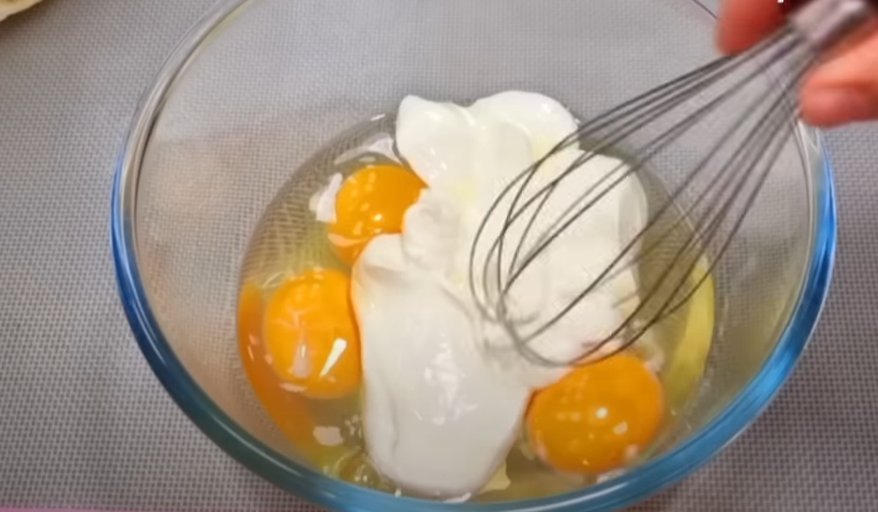 2. Atskirame dubenyje išplakite 3 kiaušinius. Sumaišykite su grietine, druska ir miltais. Gerai įmaišykite į tešlą.