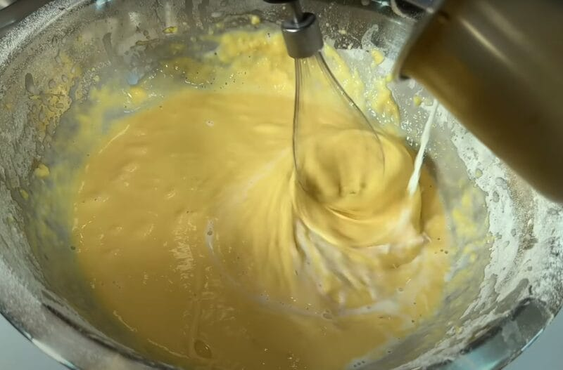 Į kiaušinių masę įsijokite miltus, supilkite pieną ir plakite mikseriu. Į tešlą pamažu pilkite verdantį vandenį ir toliau maišykite tešlą.