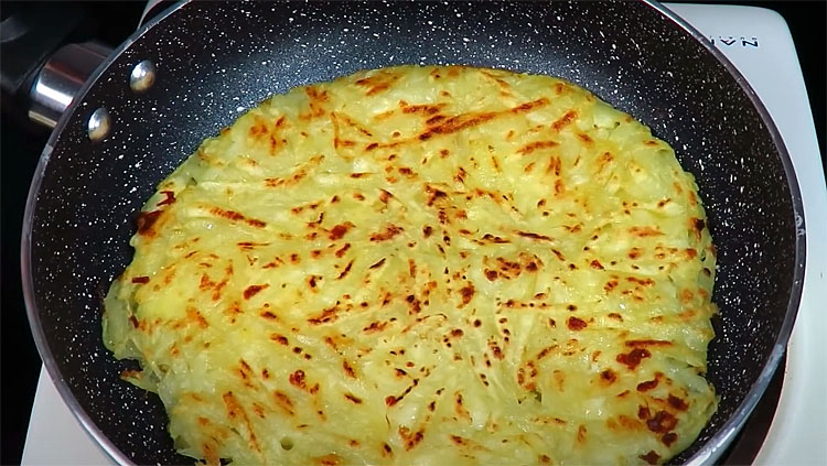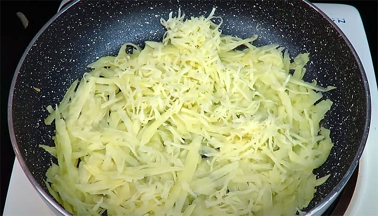3. Keptuvę įkaitinkite ant vidutinės ugnies ir įkaitinkite ją su trupučiu aliejaus (augalinio arba alyvuogių aliejaus), kad bulvės nepriliptų. Tolygiai sudėkite pusę tarkuotų bulvių (apie 2 bulves). Atsargiai paskleiskite, suformuodami paplotėlį. Sluoksnis turėtų būti maždaug 1–1,5 cm storio. Bulves nedelsdami pabarstykite tarkuotu mocarela (apie 50 gramų). Kepant sūris išsilydys ir padės surišti paplotėlio sluoksnius. Ant sūrio uždėkite likusias bulves (dar 2 bulves). Švelniai paspauskite paplotėlį, kad jis įgautų stabilią formą.