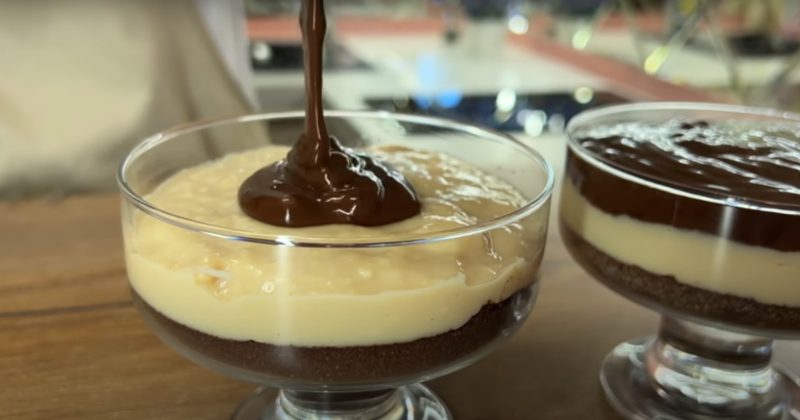 Dubenėliuose, skirtuose patiekti, sausainių trupiniai yra subartyti, ant jo užpilami pieno ir karamelės masė.