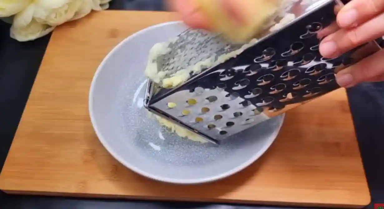 Bulves, svogūnus ir česnakus sutarkuokite smulkiausia tarka, kad masė gautųsi vientisa, kaip blynams.