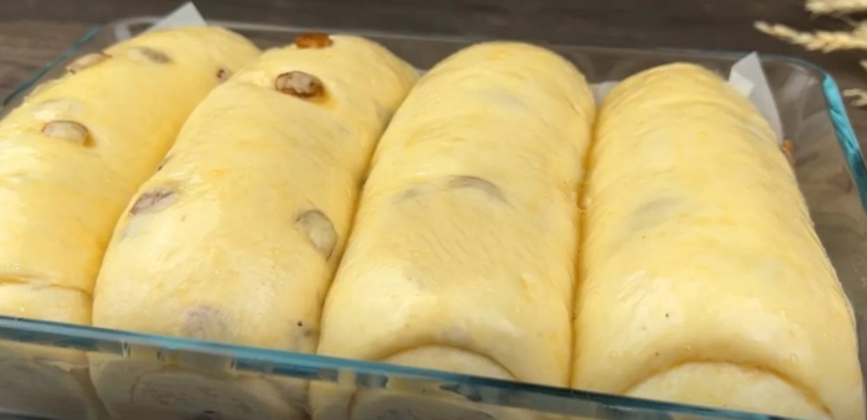 . Išminkykite tešlą ir padalykite ją į 2 lygias dalis. Kiekvieną tešlos dalį iškočiojame iki 8 mm storio sluoksniu