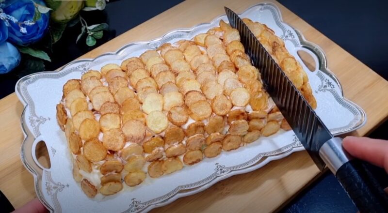Sutepkite šonus ir paviršių majonezu, visiškai uždenkite salotų struktūrą bulvių griežinėliais.