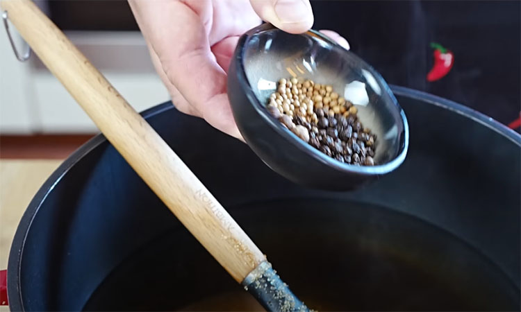 Pirmiausia užvirinkite litrą vandens ant viryklės. Užvirus, suberkite cukrų ir maišykite, kol visiškai ištirps. Tada suberkite juoduosius ir kvapiuosius pipirus, kalendros sėklas ir medų, nuolat maišydami, kol medus ištirps. Tada vėl užvirinkite mišinį ir įpilkite acto, išjungdami ugnį.