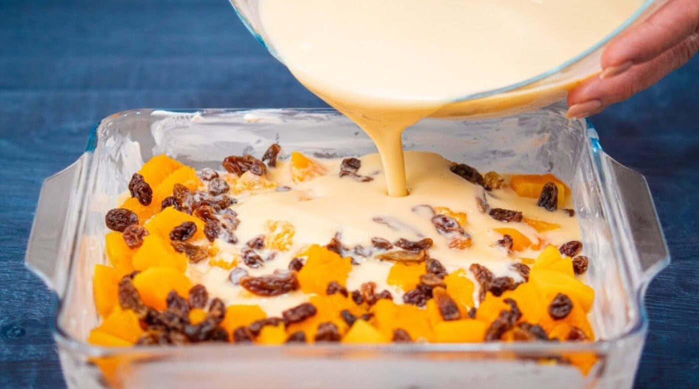 . Išpilkite moliūgų vandenį, pyrage neturi likti vandens. Kepimo formą ištepkite sviestu, ant dugno išdėliokite moliūgo gabalėlius. Nusausinkite sultenes, sudėkite jas ant moliūgų sluoksnio