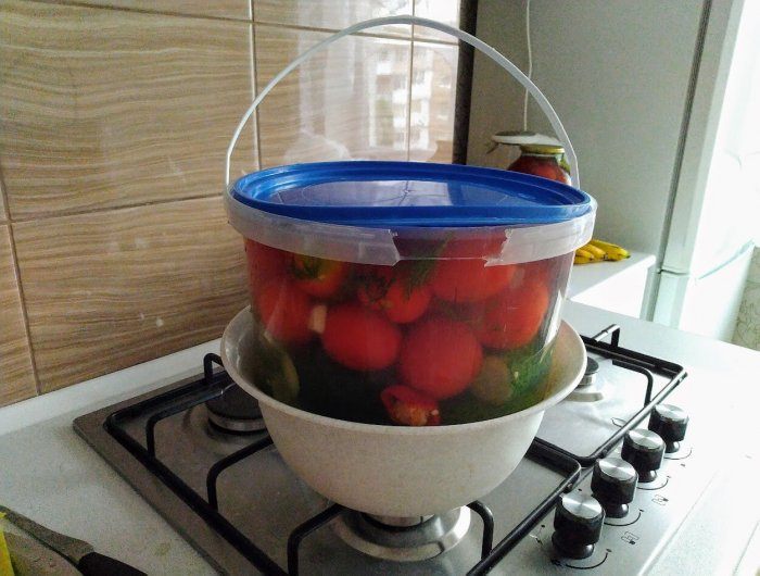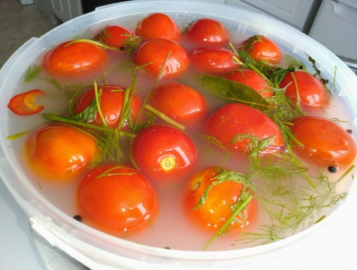 Du šaukštai cukraus ir tiek pat druskos kiekvienam litrui vandens, išmaišyti ir užvirinti. Pomidorus užpilkite karštu marinatu, kad jie būtų visiškai apsemti skysčio. Uždenkite dangčiu, palikdami šiek tiek tarpo tarp jo ir indo kraštų.