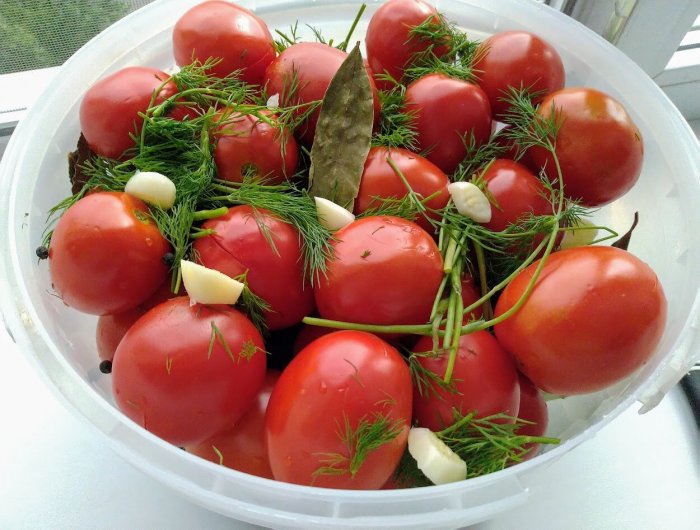 Trims kilogramams pomidorų reikės vienos galvutės česnako, šiek tiek krapų, juodųjų pipirų žirnelių, susmulkintos aitriosios ankšties ir dviejų ar trijų lauro lapų.