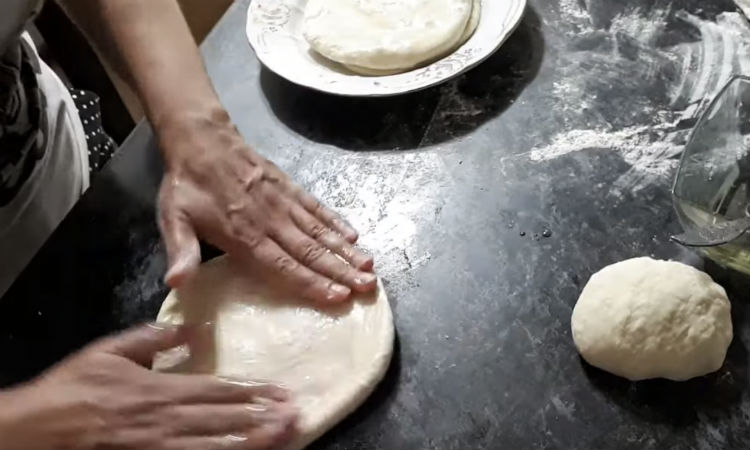 1. Į gilų dubenį persijokite miltus ir druską. Tai padės tešlai tapti puresnei. Palaipsniui pilkite vandenį, minkydami tešlą. Pradėkite nuo 250 ml vandens ir, jei reikia, įpilkite daugiau, kol tešla taps minkšta ir elastinga.