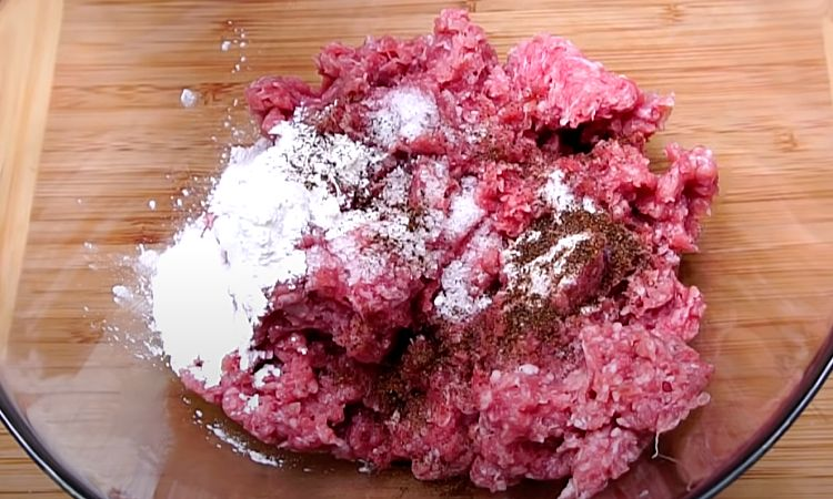 1. Sudėkite maltą mėsą į didelį dubenį, įberkite kepimo sodos, druskos, juodųjų pipirų, krakmolo ir spaustų česnakų. Tada supilkite grietinėlę, kad masė būtų sodresnė. Visus ingredientus gerai išmaišykite iki vientisos masės.