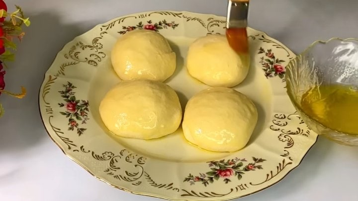 Į verdantį vandenį įberkite druskos ir išmaišykite. Suberkite manų kruopas ir miltus. Rankomis minkykite minkštą tešlą. Uždenkite rankšluosčiu ir palikite 10 minučių. Padalinkite į 4 dalis. Kiekvieną dalį susukite į rutulį. Patepkite augaliniu aliejumi (arba perpus sviestu + margarinu). Palikite dar 10 minučių.