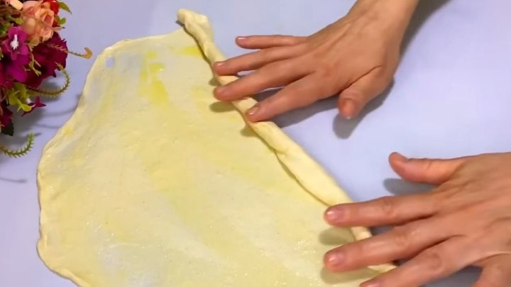 Paimkite 1 tešlos gabalėlį. Pirštais suplokštinkite jį. Dabar pradėkite tempti, stengdamiesi neplėšti. Įdėkite daugiau sviesto. Kai tešla ištemps pakankamai plonai, susukite ją į ritinį.