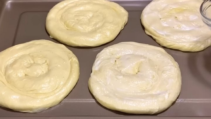 Po dar 5–10 minučių sraiges perkelkite ant kepimo skardos, išklotos kepimo popieriumi. Pirštais jas šiek tiek suplokštinkite. Viršų patepkite jogurtu.
