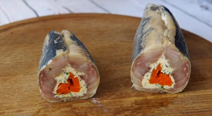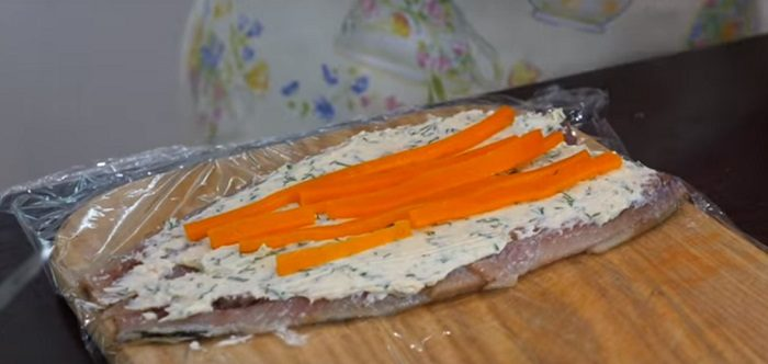Pjaustymo lentelę uždenkite maistine plėvele ir ant jos uždėkite vieną žuvies filė. Sūrio tešlą padalinkite į dvi dalis, vieną dalį (apie 1,5 valgomojo šaukšto) užtepdami ant žuvies ir tolygiai paskirstydami ant filė. Ant viršaus uždėkite pjaustytų morkų juostelėmis.