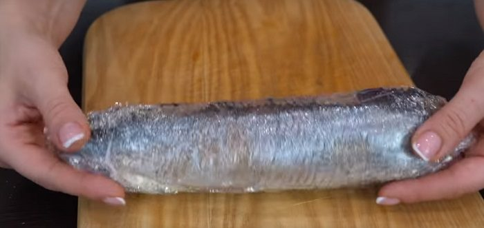 Maistine plėvele susukite žuvį į ritinį, įsitikindami, kad maistinė plėvelė visiškai apgaubia ritinį. Paruoštą įdarytą žuvį laikykite šaldytuve apie 3 valandas arba, jei turite laiko, geriausia per naktį.
