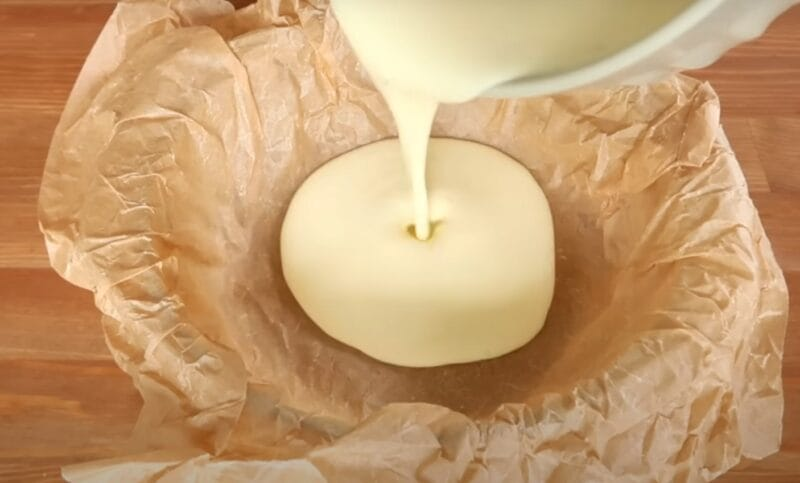 Susmulkiname pergamentą ir uždengiame 18-20 cm skersmens kepimo inde.