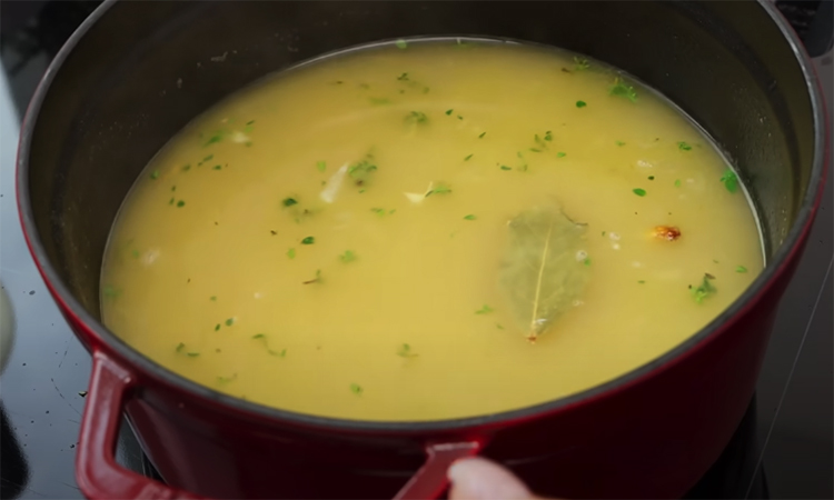 Dideliame puode ant vidutinės ugnies užpilkite vištieną šaltu vandeniu, neberkite druskos. Užvirinkite ant silpnos ugnies, sumažinkite ugnį iki minimumo ir nugriebkite putas, kol sultinys taps skaidrus. Troškinkite, šiek tiek pravertą dangtį, 1,5–2 valandas, kol mėsa suminkštės. Galiausiai įberkite druskos, lauro lapų ir česnako arba šiek tiek imbiero pagal skonį.