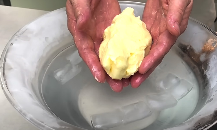 Palaipsniui mišinys pagels ir sulips į minkštą sviestą. Nusausinkite likusį skystį iš dubens – tai pasukos, kurias galima naudoti kepiniams arba marinatams. Suformuotą sviestą nuplaukite: įpilkite šalto vandens ir rankomis išminkykite sviestą, tada nusausinkite.