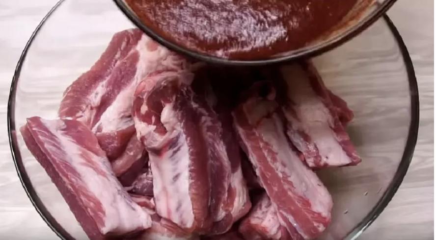 • Toliau – mėsa. Apie 1,2 kg kiaulienos šonkauliukų užpilu marinatu, kruopščiai įtrinu, kad kiekvienas gabalėlis įsigertų, ir palieku bent pusvalandžiui. Jei įmanoma, marinuokite ilgiau: skoniui tai tik į naudą.