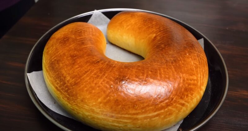 Mes gaminame tešlą, ant stalo sukuriame storą tortiliją, kurią sulenkiame voką. Uždenkite tešlą dubeniu ir pailsėkite 15 minučių. Tada tešla sukama plonu sluoksniu 50×30 cm.