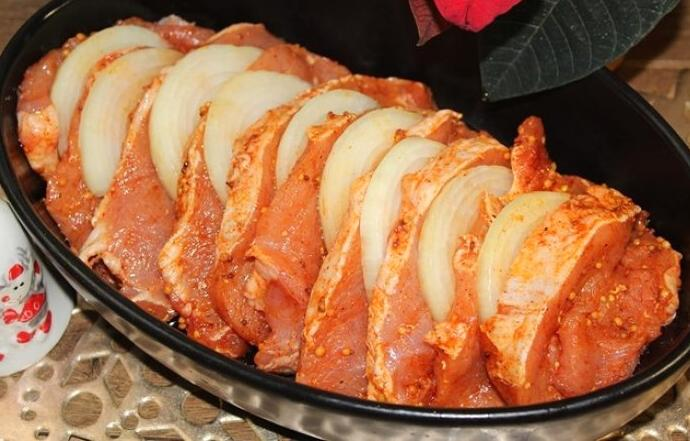 1. Kilogramą mėsos reikia supjaustyti gabalėliais, apvolioti druskoje, aliejuje, prieskoniuose ir garstyčiose.