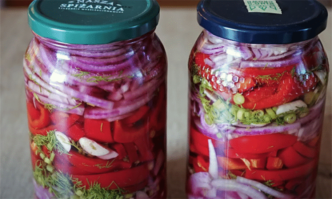 Geriausias užkandis prie šašlyko, mėsos ir net vištienos. Marinuoti svogūnai ir paprikos.