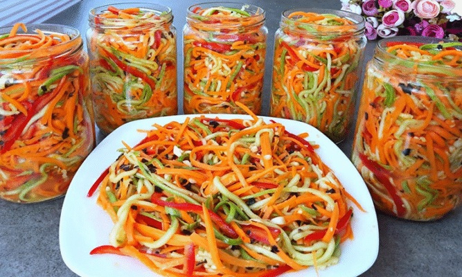 Daržovių salotos žiemai. Tai puikus priedas prie įprastų kopūstų šaltuoju metų laiku.
