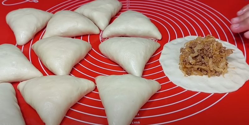 Mes dalijame tešlą į porcijuotas kolobes, kiekviena išvyniota, išdėsto įdarą ir formuoja pyragus.