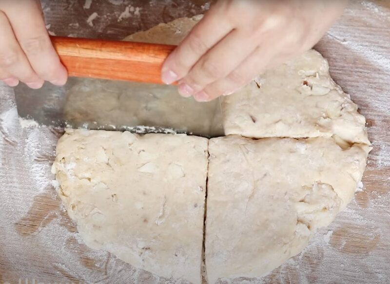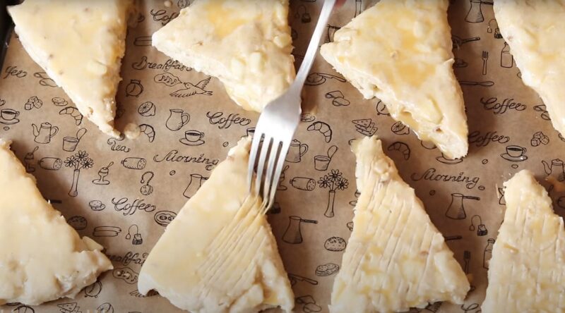 Padalinkite bandelę į 8 trikampius ir sudėkite juos ant kepimo popieriumi išklotos skardos. Aptepkite bandeles išplaktu kiaušinio ir pieno mišiniu, šakute padarydami griovelius.