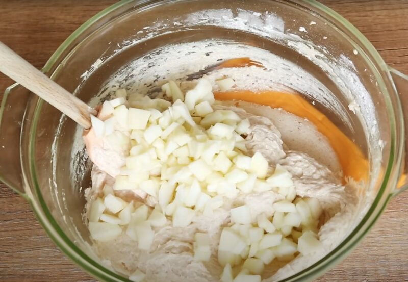Nulupkite obuolius, supjaustykite juos mažais kubeliais ir susmulkinkite graikinius riešutus. Sudėkite obuolių griežinėlius ir graikinius riešutus į tešlą, išmaišykite ir suberkite likusius miltus.