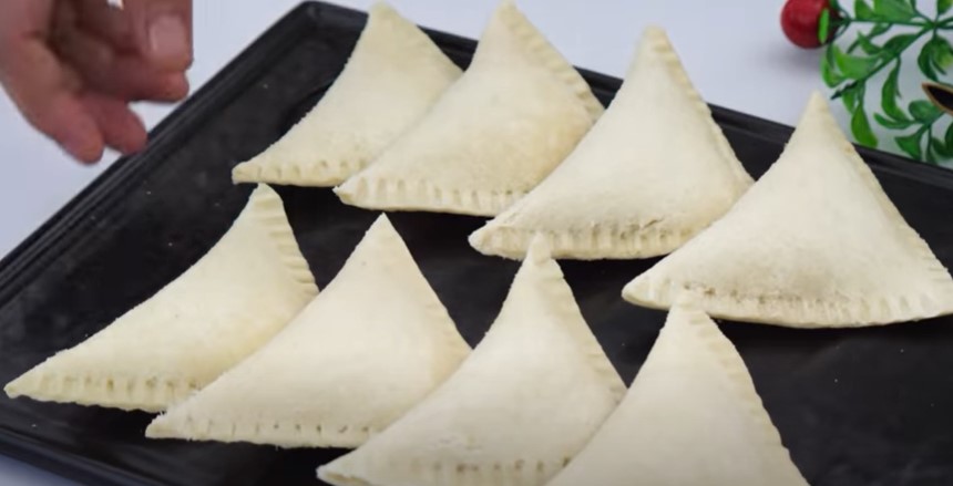 Ant viršaus uždėkite tarkuotą sūrį, uždenkite griežinėlį kitu kraštu ir gaukite trikampį pyragą.