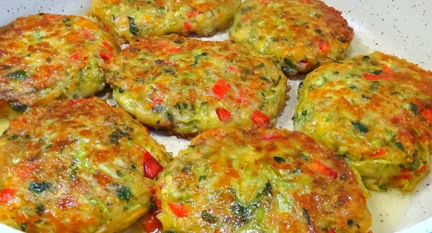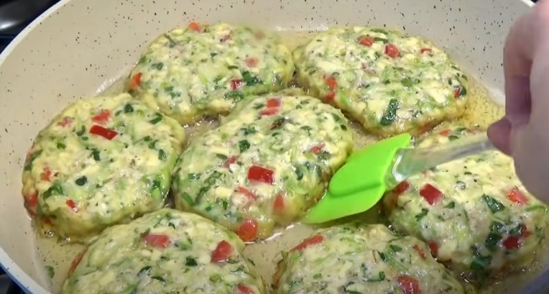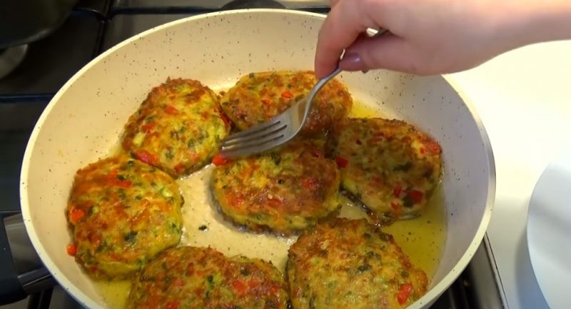 Cukinijos kotletai su saldžiaisiais pipirais, sūriu ir avižiniais dribsniais. Pasirodo, labai patrauklu ir patenkinama.