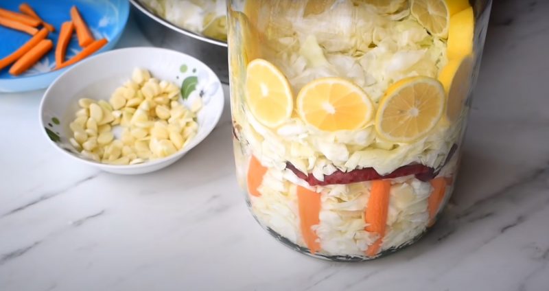 Tokiu būdu kaitaliokite daržoves ir citriną, pripildydami stiklainį iki viršaus.