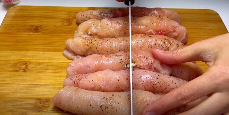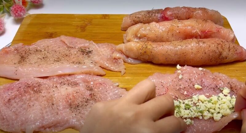 Vištienos krūtys turi būti supjaustytos į dvi dalis. Padengta mėsa su plėvele ir gerai sugauti iš abiejų pusių. Nepamirškite pabarstyti ir įtrinti krūtinėlės skaidulų druska ir mėgstami prieskoniai.