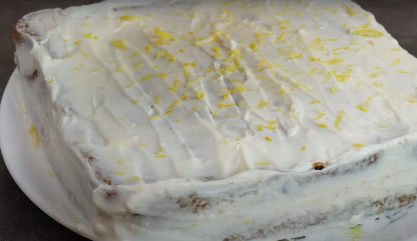 . Aptepkite torto šonus ir viršų, apibarstykite citrinos žievele ir palikite šaldytuve 8 valandoms.