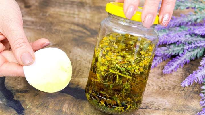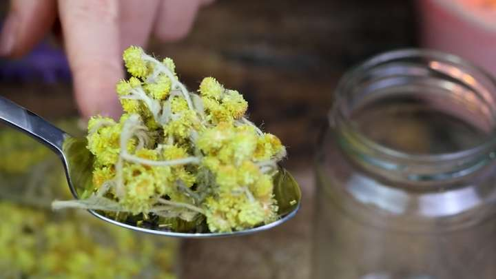 Į litro stiklainį įdėkite po 1 kupiną valgomąjį šaukštą džiovintų šlamučių, medetkų, jonažolių ir ramunėlių žiedų. Jie puikiai tinka kovai su su amžiumi susijusiais odos pokyčiais, paraudimui ir sausumui mažinti, odos regeneracijai skatinti.