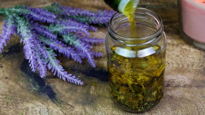 Dar vienas svarbus ingredientas yra gvazdikėliai; jums taip pat reikės 1 valgomojo šaukšto. Jie padeda sulėtinti senėjimo procesą, nes juose yra antioksidantų. Galiausiai įdėkite 1 maišelį grynos žaliosios arbatos (atidarykite ir išpilkite turinį arba naudokite 1 valgomąjį šaukštą birios arbatos be priedų). Užpilkite visas žoleles apie 0,5 litro nerafinuoto alyvuogių aliejaus. Tada užsandarinkite stiklainį, padėkite jį ant palangės ir leiskite pritraukti 2–3 savaites.