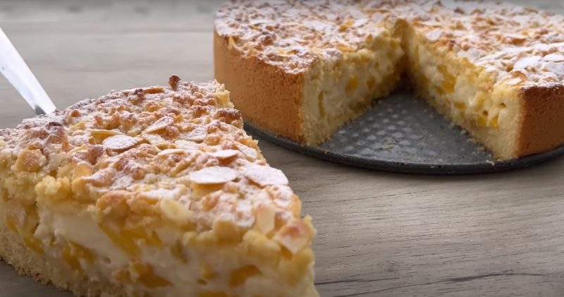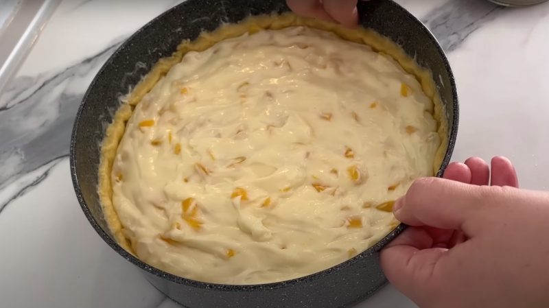 Mes supilame į persikų grietinėlės gabalėlius, vėl sumaišome ingredientus. Kremas perkeliamas iš kūno į pelėsį su bandymu, tolygiai pasiskirstančiu ant paviršiaus.