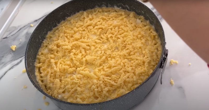 Mes sijojame į kiaušinių mišinį miltų su kepimo milteliais, nesumaišykite lipnios kalios tešlos. Nedidelis testas siunčiamas į šaldytuvą 20 minučių. Likusi dalis paskirstoma 24 cm skersmens apačia ir sienomis.