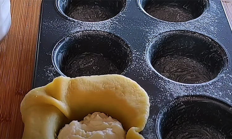 Įdarui sumaišykite varškę su kiaušiniu, cukrumi ir vaniliniu cukrumi. Gerai išmaišykite iki vientisos masės. Keksiukų formeles ištepkite sviestu ir pabarstykite miltais. Supilkite tešlą į formeles, į vidurį įdėkite varškės įdaro ir atsargiai užlenkite kraštus.