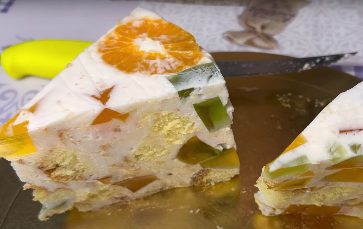 Gausite neįprastos spalvos tortą iš želė, grietinėlės ir biskvito. Šiame recepte biskvitą galite pakeisti, pavyzdžiui, sausainiais.
