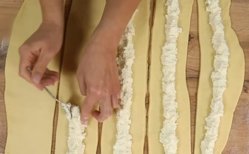 Tešla yra proporcinga ir suvyniota į stačiakampį didelį sluoksnį, kurio storis mažesnis nei 1 cm. Mes dalijame tešlą ant juostelių, kurių kiekvieno plotis yra 8 cm.