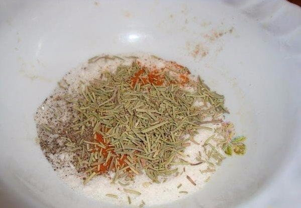 Paruoškite prieskonių mišinį: grūstuvėje sumaišykite druską, pipirus ir rozmariną.