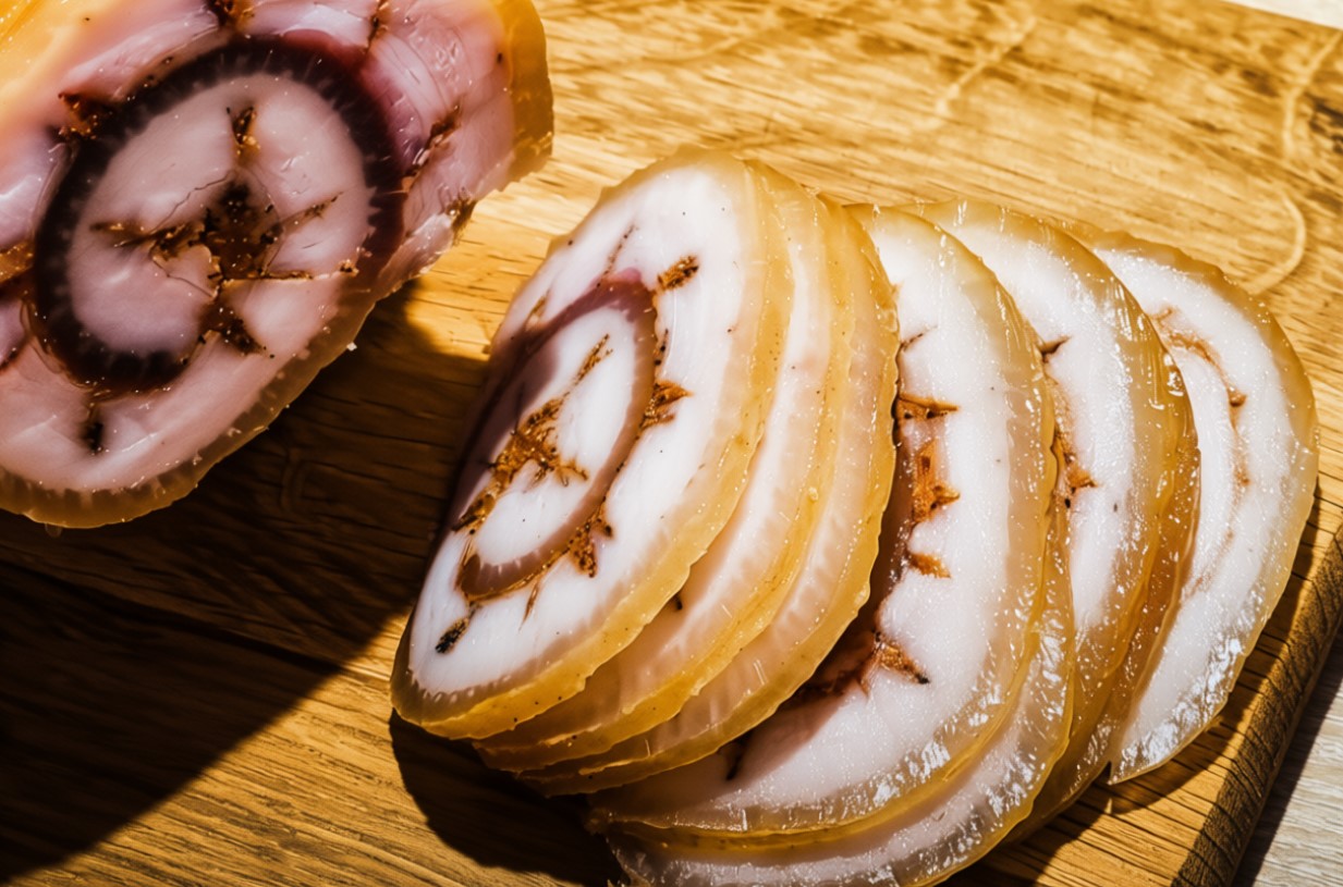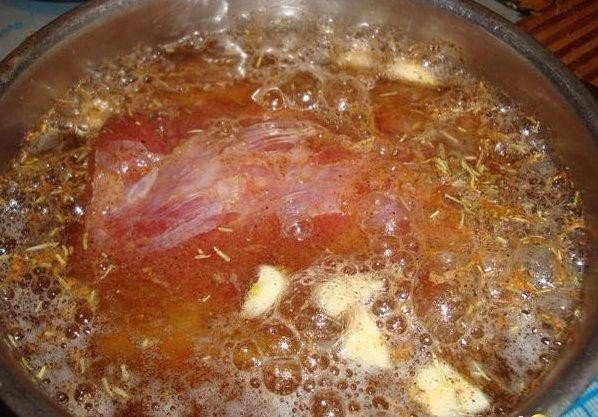 Gautu mišiniu įtrinkite mėsą ir leiskite mirkti porą valandų. Susmulkinkite česnaką ir suberkite jį į mėsą. Užpilkite mėsą alumi.