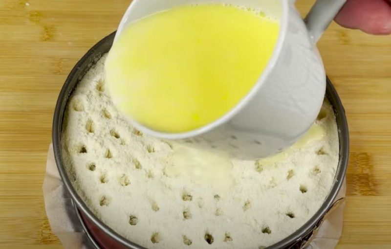 Mes šildome pieną iki 60-70 laipsnių, atskirai ištirpinkite sviestą. Sumaišykite šiuos skystus komponentus ir supilkite į ruošinį.