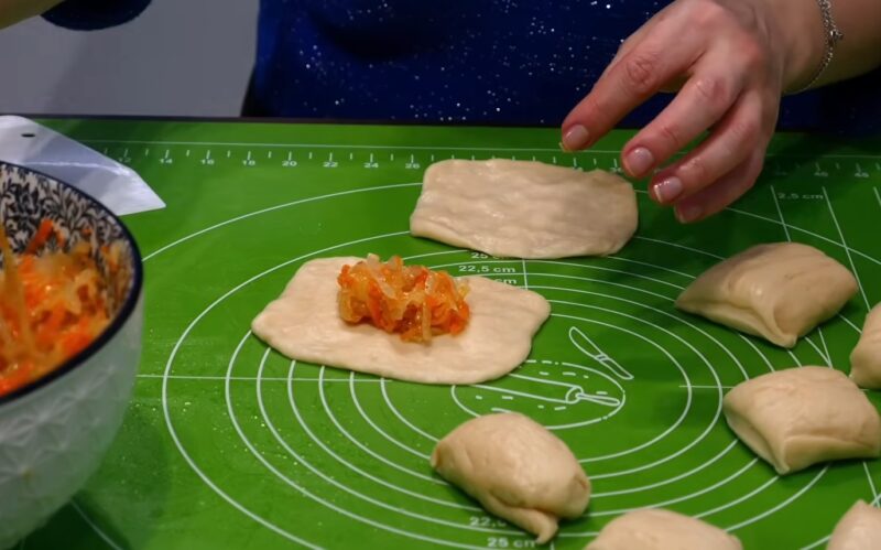Į kopūstus ir morkas įpilti keptų svogūnų. Mes gaminame tešlą ir dalijame 14-16 identiškų kolobų, kiekvieną iš jų suvyniojame į storą torpedą.